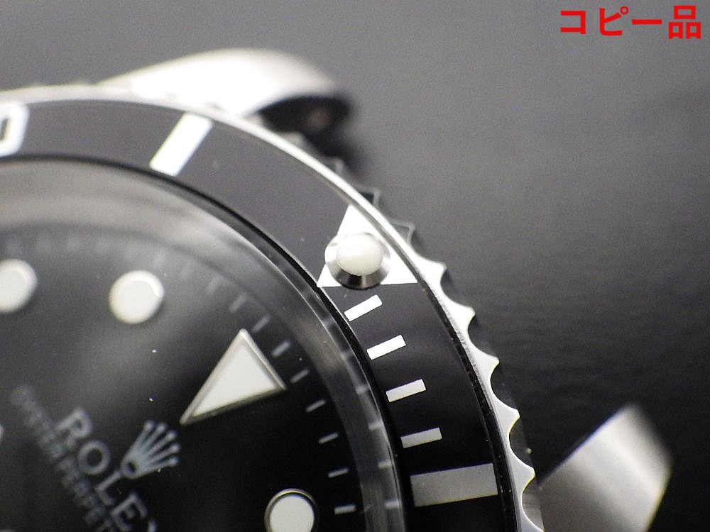 コピー品:ベゼルディスクに対して傾斜がきつい、溝の境目がとがっていて、造りが荒い